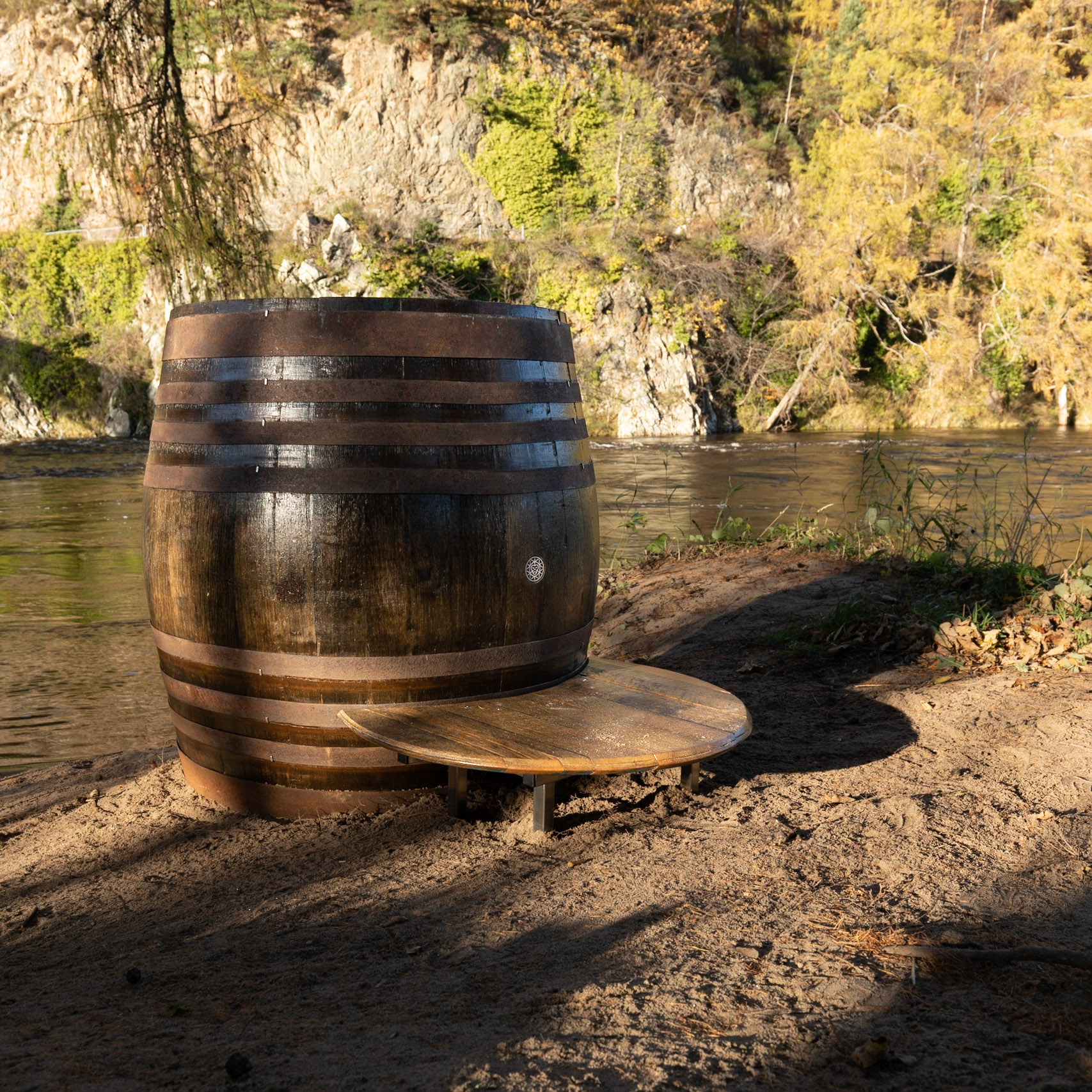 Promotional photographs for a new water cold plunge in repurposed whisky barrels from Brassmonkey. Brassmonkey are a UK-based company producing ice baths and cold water plunges.